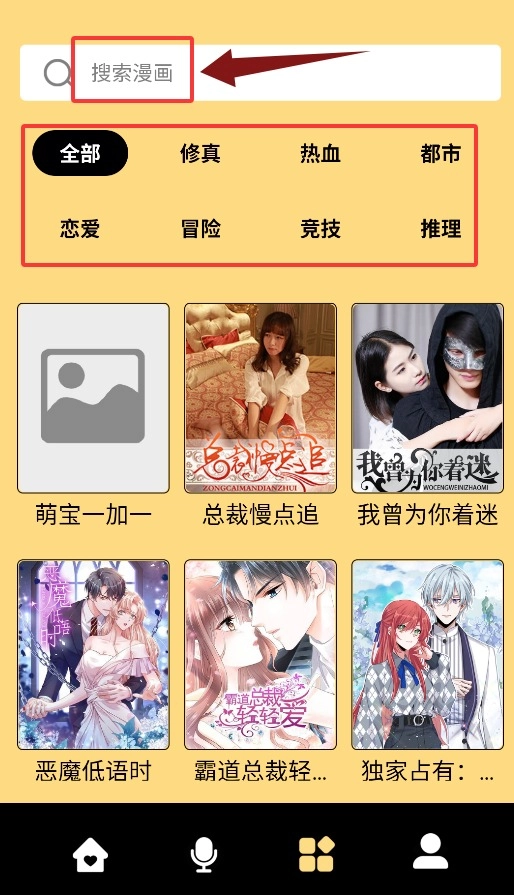 分类界面不仅可以搜索漫画,还能按照修真、热血、都市等不同类型进行浏览。