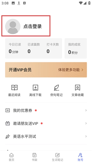 进入【账号】页面后,找到页面上方的【点击登录】区域,点击该区域即可进入登录相关操作界面。