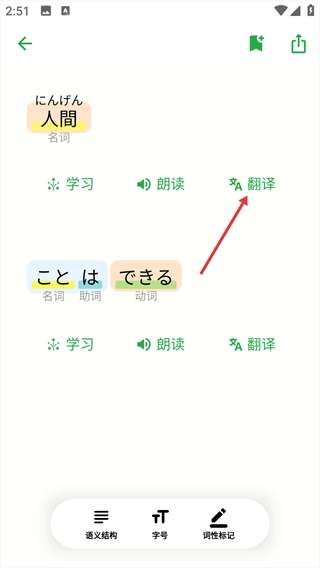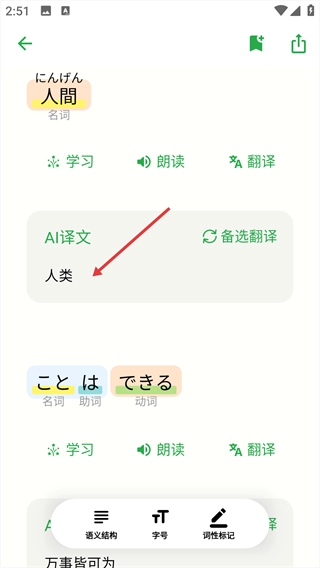 页面会展示对应内容的译文,例如【人間】所对应的译文是【人类】。