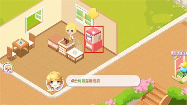 在本站完成安装并进入游戏后,玩家需要先点击烤箱上的泡泡,以此来进行蛋糕的制作流程。