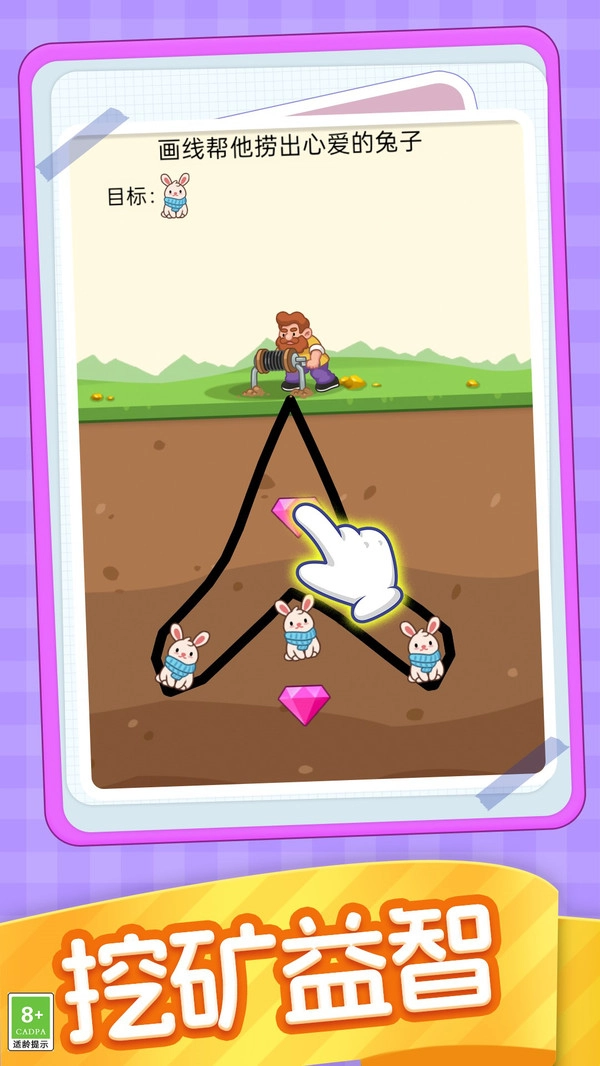 萌萌的小兔子藏在各种各样的障碍物后面,得精准把控角度和力度,通过画线避开陷阱,成功把兔子捞出来的那一刻,满满的成就感会立刻涌上心头。