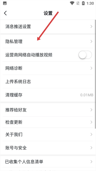 在设置界面,点击【隐私管理】。