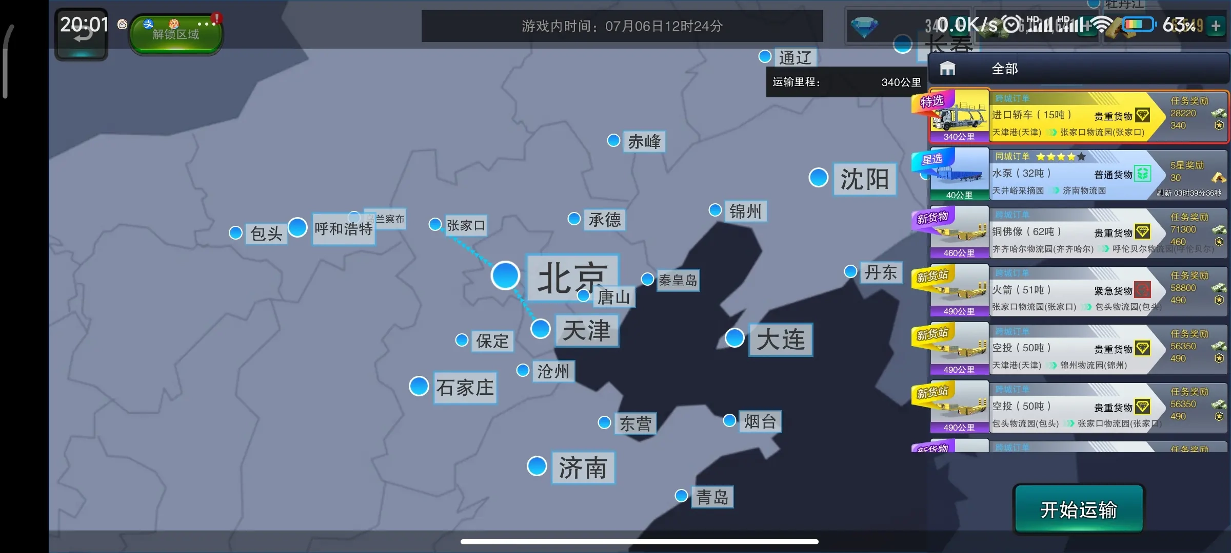 路线规划:在成功获取闪龙之后,若货物情况相同,优先选择呼伦贝尔→齐齐哈尔这条固定路线,其高速占比高、弯道与匝道少,行驶速度更快且能避免货损;若需完成刷订单任务,推荐两条高效线路:东营物流园→胜利油田、丹东物流园→丹东港,这两条路线全程行驶均仅需1分钟。