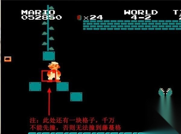 首先撞击下方的方块,接着撞出藤蔓方块,然后沿着藤蔓向上攀爬。(注意:藤蔓方块的下方还存在一个方块,一定不能先去撞击它,不然就没办法撞出藤蔓了)