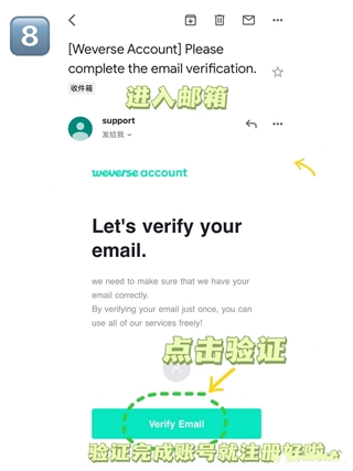 打开自己的邮箱,会收到一封验证邮件,点击“Verify Email”按钮即可完成验证,此时Weverse账号注册就全部完成了,返回后就能登录啦。
