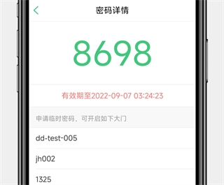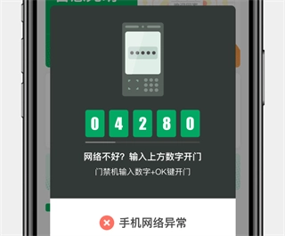 当远程开门无法成功时,应用会弹出一组五位数的“无网口令”动态密码,您可在门禁机上输入该密码来开门,这种方式适用于没有网络的场景。