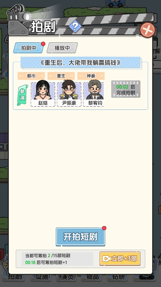 我要拍短剧是一款模拟经营类休闲游戏,游戏里有超多不同的玩法和经典的模拟剧情等你来探索。在这里你可以自由安排剧本进行拍摄,可爱的游戏画风和大量Q版卡通人物都在这儿等你,玩起来相当有趣充实,感兴趣的朋友赶快来本站体验吧!