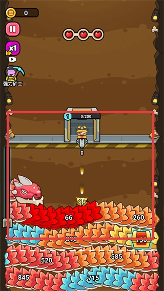 操控角色在矿场里移动,攻击下方的【红色-龙形-目标】,积累像【45】这样的数值,与此同时留意上方【3-红心】的生命值。
