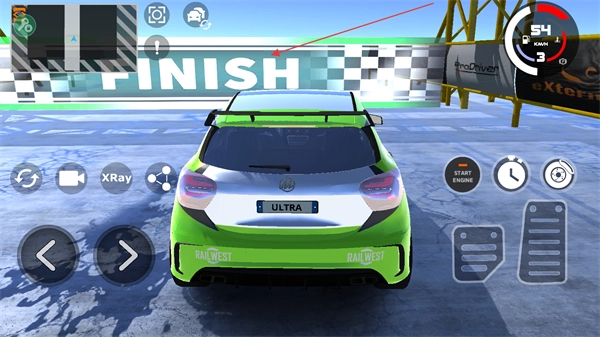 操控车辆沿着赛道不断行驶,直到抵达标有FINISH标识的终点区域,以此完成当前关卡的驾驶挑战,推动关卡进度向前。