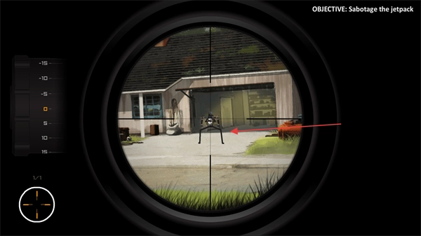 查看任务“Sabotage the jetpack”,通过狙击镜瞄准目标的喷气背包,准备发起攻击。