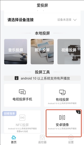 打开爱投屏手机端后,第一步是连接电视,需要点击“请选择设备连接”选项。