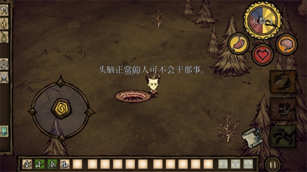 你可以简单留意一下右上角,那里显示着三个基础属性,分别是饥饿值、血量和理智值。要记住,必须保持这些属性的平衡,这样才能更好地生存下去。