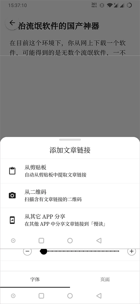 慢读支持通过添加文章链接、读取剪贴板内容或扫描二维码的方式打开网页,方便用户快速获取并阅读文章。