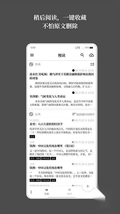 可以从网页或其他渠道收集文章,保存到手机本地后,即便原文被删除也能随时阅读。