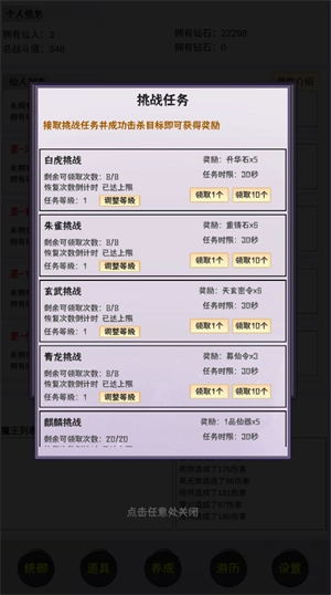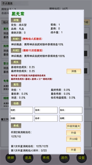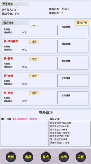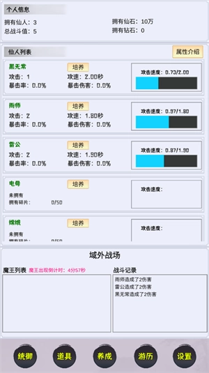 养成大仙:玩家能够培养上古时期的大仙,借助持续的修炼与战斗,增强他们的实力,最终战胜域外天魔,守护仙界的和平。