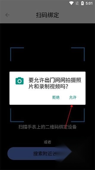 在弹出的窗口里点击“允许”,接着用手机扫描手表屏幕上呈现的二维码,这样就能完成绑定操作了。