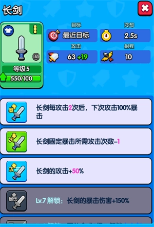 长剑初始攻击力较高,射程也比较远,能够提前击败远处的敌人。