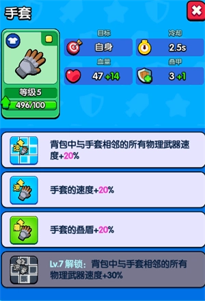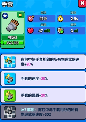 手套是一种辅助功能较强的装备,能为附近的武器提供较高的攻击速度加成。