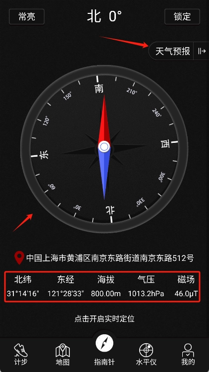 登录后,进入首页就能使用最核心的指南针功能,该功能配备了多种参数,可助力实现精准导航。