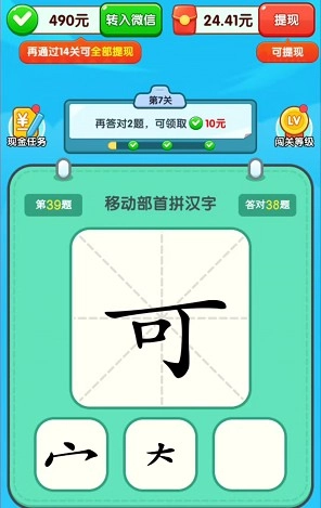 玩家通过移动部首拼凑汉字,答对题目即可领取红包,新人简单尝试就能拿到两个小红包;每答对5道题看一次广告,还能额外获得一个红包。这些红包支持提现,且提现按百分比计算,提升提现比例的难度不算大。
