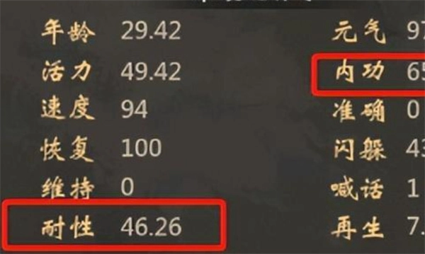 人物属性里最关键的两个方面是内功与耐性,内功值类似于蓝量,能通过药品回复到4%;耐性属于减伤属性,其上限为13%。