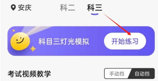 在底部点击“练车”按钮,切换至科目三界面,随后点击“开始练习”,就能进入科目三灯光模拟练习环节。