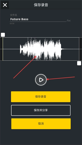 进入【保存录音】界面后,你可以先点击播放按钮试听刚才的录音,之后再根据需要选择【保存录音】【保存并分享】或者【取消】这几个选项来处理已录制好的内容。