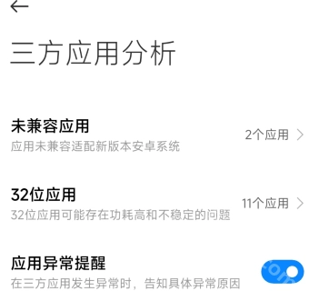 三方应用异常分析是小米推出的一款针对第三方应用崩溃问题的分析工具,它能协助我们检测第三方应用与手机系统的兼容性情况,同时也可用于排查手机突发闪退的具体原因。该工具设有异常反馈机制,当遇到闪退等异常状况时,用户能够直接将问题反馈给小米官方或对应应用的开发者,并且还会同步提供相应的解决方案。