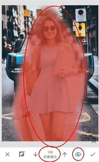在涂抹人物边缘轮廓时,我们可以用大拇指和食指在图片上做扩张动作,把图片放大到最大来方便处理。不过像下面这张图显示的情况:就算把图片放到最大,人物小轮廓的位置还是因为手指太大,没法进行精确涂抹。这里有个建议,就是先把双重曝光数值调到0,这样可以隐藏掉部分内容。
