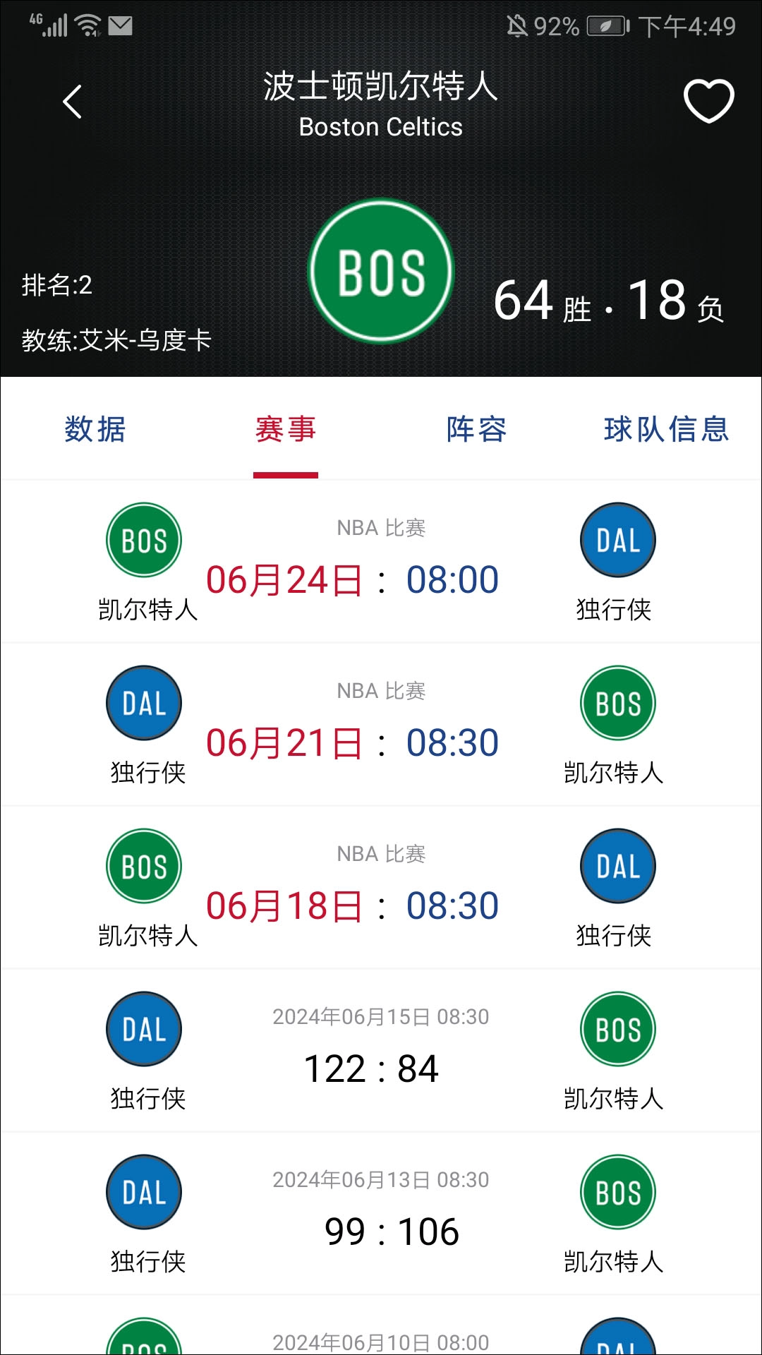 打开软件后,进入赛事界面,这里涵盖了NBA、CBA、英超、西甲、意甲等各类赛事,下面就以NBA凯尔特人队为例进行说明。