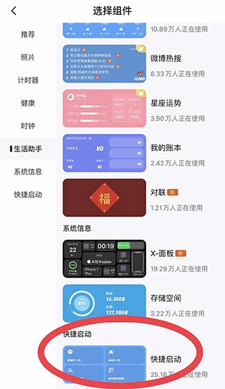 首先打开软件,在中号小组件里找到快捷启动;