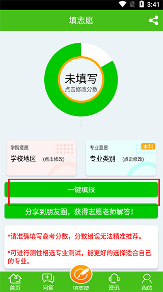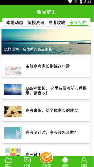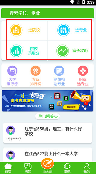 1在本站下载并安装软件后,运行该软件,您会发现它包含首页、问答、填志愿、资讯和我的这五个部分。