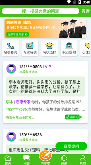 3、点开问答,用户可以在线咨询志愿专家,帮助学生更好的选择院校、专业;