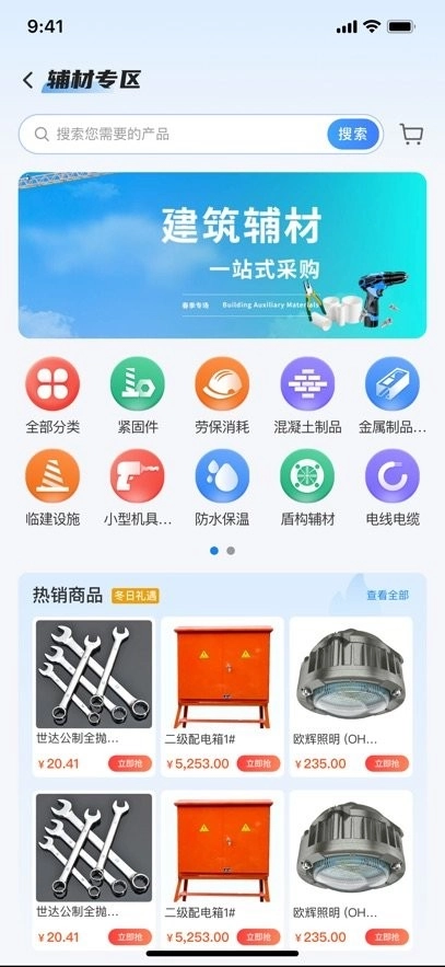 平台设置了商品专区分类,涵盖辅材专区、办公用品专区等,供用户浏览选购。