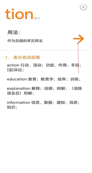 进入词根词缀第1组的tion后缀页面,查看该后缀的用法说明,并了解相关例词的释义内容。