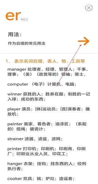 继续学习该组er后缀的相关内容,探究其作为名词后缀的具体用法,并熟悉对应的例词及其含义。