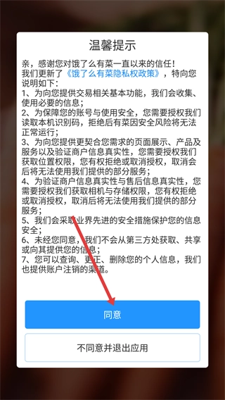 当弹出《饿了么有菜隐私政策》的温馨提示窗口时,请先阅读相关内容,然后点击【同意】按钮,这样就能继续使用应用的各项功能了。