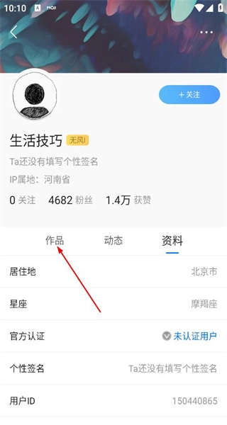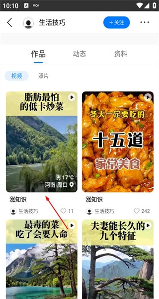 进入生活技巧账号的主页,查看资料信息,然后点击作品选项,切换到该账号的作品展示页面。