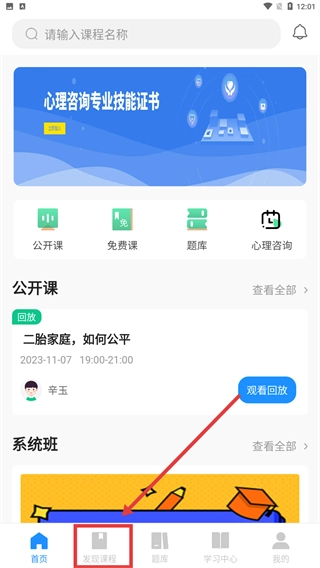 在首页底部找到【发现课程】按钮并点击,进入课程列表页面后,即可浏览各类心理相关课程。