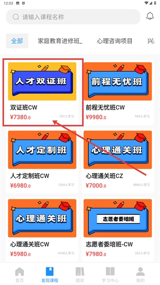 在课程列表里挑选你要找的课程(比如【双证班CW】),接着点击进入这门课程的详情页。