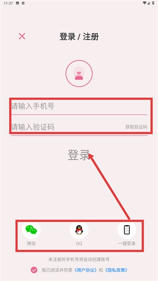 在登录/注册页面,用户既可以通过填写【请输入手机号】和【请输入验证码】来登录,也可以选择【微信】【QQ】或【一键登录】的方式完成账号验证。