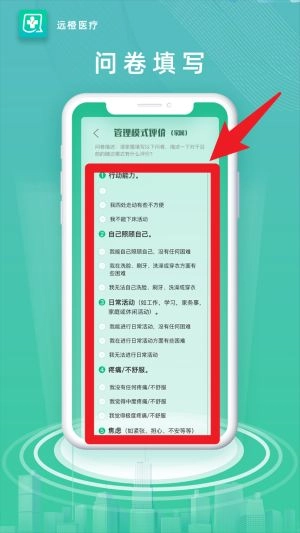 在问卷填写功能里,用户能够依照提示完成健康管理评估,涵盖行动能力、日常活动、疼痛不适以及心理状态等多个方面的信息。