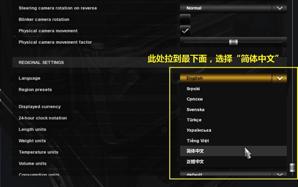 2、接着在语言栏中下拉找到中文选项,选中它即可完成设置。