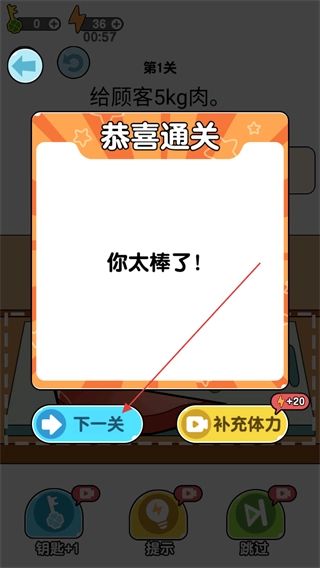 1、按照关卡给出的要求,为顾客提供5kg的肉,并且需要在虚线划定的范围内切割肉块。