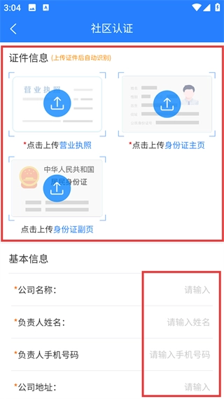 在社区认证页面,需要先上传【营业执照】【身份证主页】【身份证副页】等相关证件信息,随后再填写【公司名称】【负责人姓名】等基本信息。