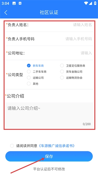 完成证件与基本信息的填写后,选择【公司类型】并填写【公司介绍】,勾选相关协议后点击【保存】按钮提交认证信息。
