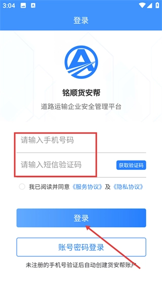 在【铭顺货安帮】的登录页面,先填写【请输入手机号码】这一栏,接着获取并填写【请输入短信验证码】,之后勾选相关协议,最后点击【登录】按钮即可完成验证步骤。