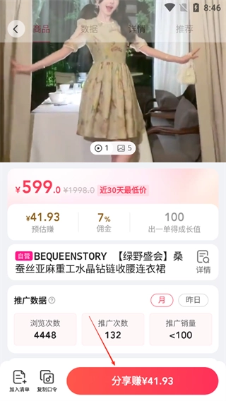 页面会显示“分享赚XXX钱”,明确标注佣金金额;