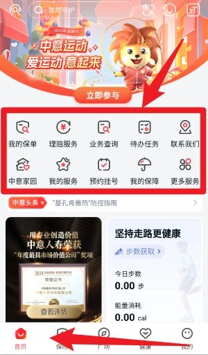 在首页点击我的保单、理赔服务、业务查询等图标,就能快速进入相应功能页面,开展保单管理、健康服务预约等操作。