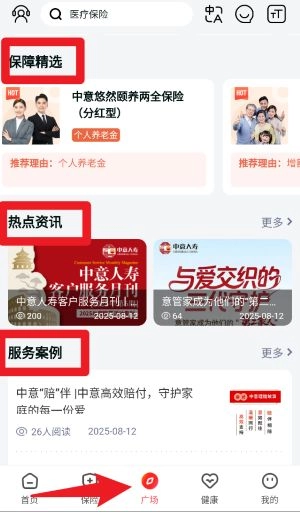 在广场板块,您可以浏览保障精选、热点资讯、服务案例等内容,从而了解保险产品的亮点以及真实的服务案例。